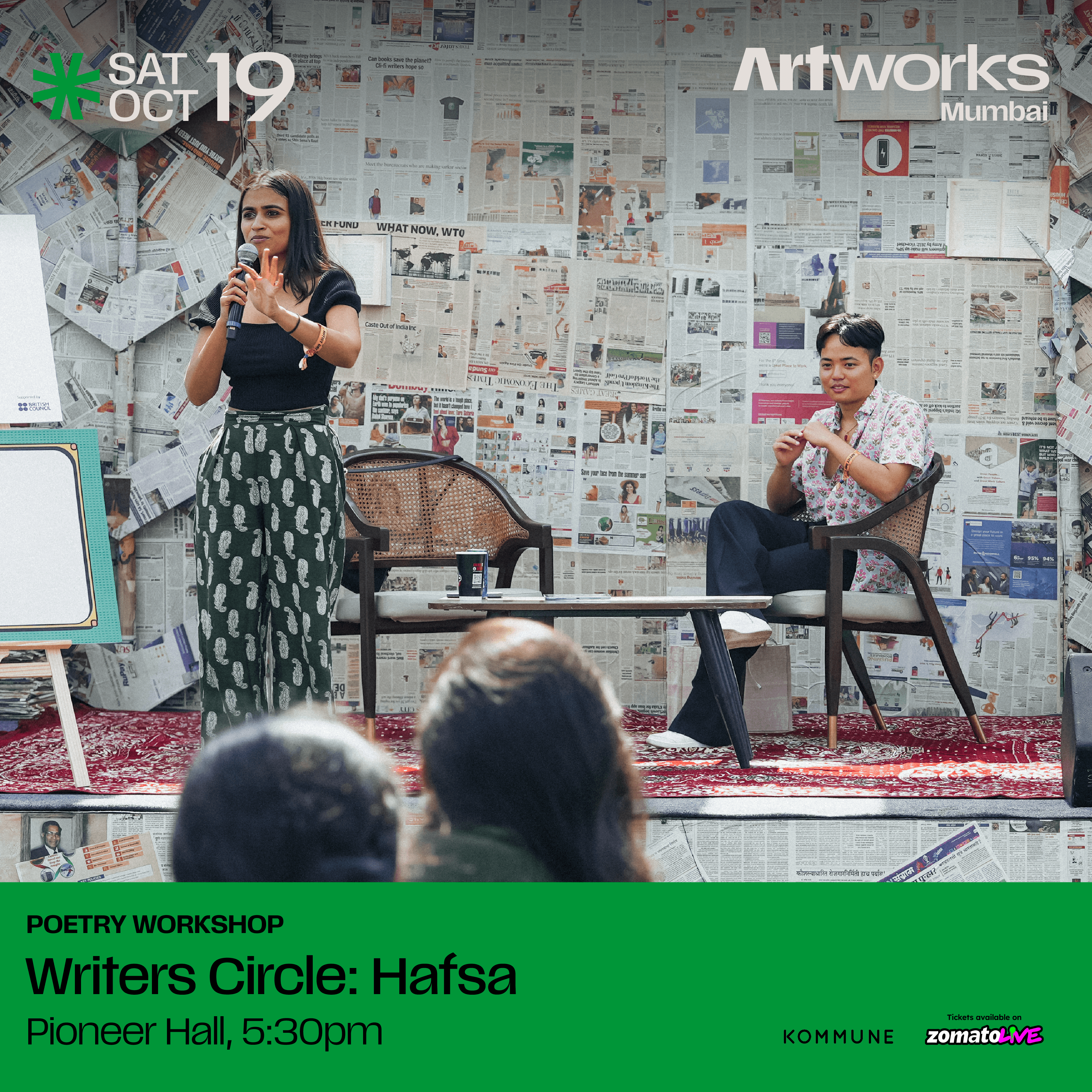 Artworks along with Kommune will be presenting spoken word performances by Hafsa and Jidnya Sujata, as well as an interactive poetry circle workshop by Hafsa, as part of The Artworks Experience on 19th October.